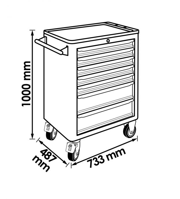 Voziček s sedmimi predali. Pet plitvih predalov in dva globoka predala. Pet predalov napolnjenih z orodjem. Dva predala prosta za dodatno orodje.