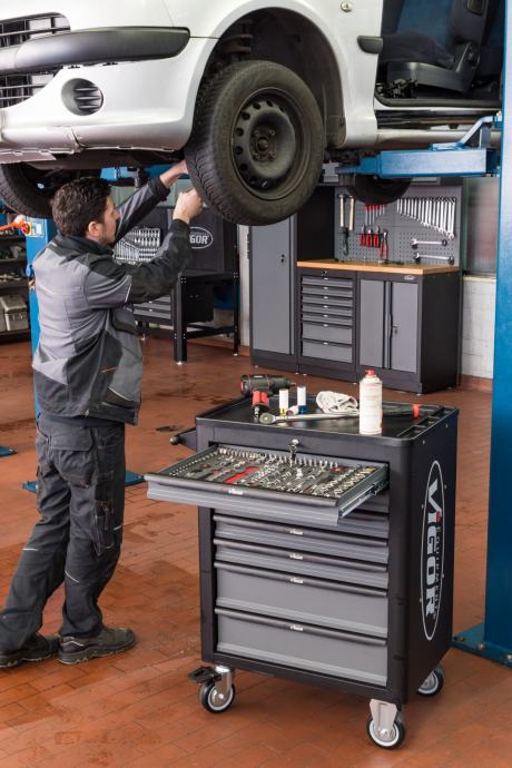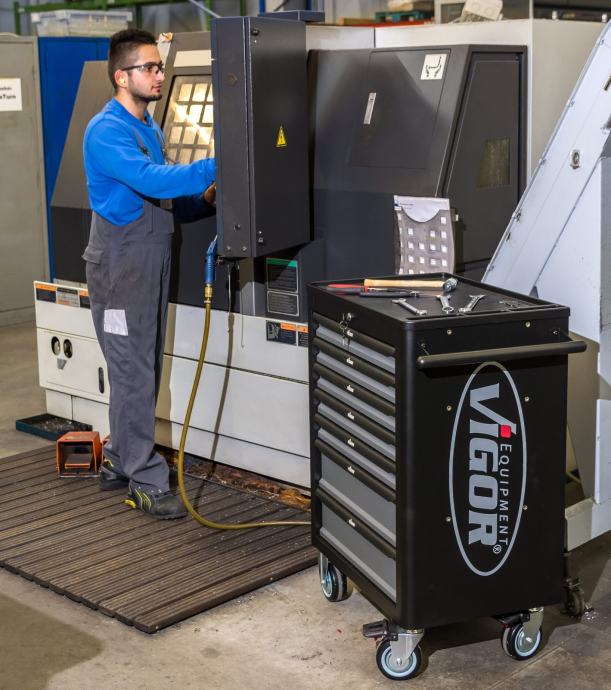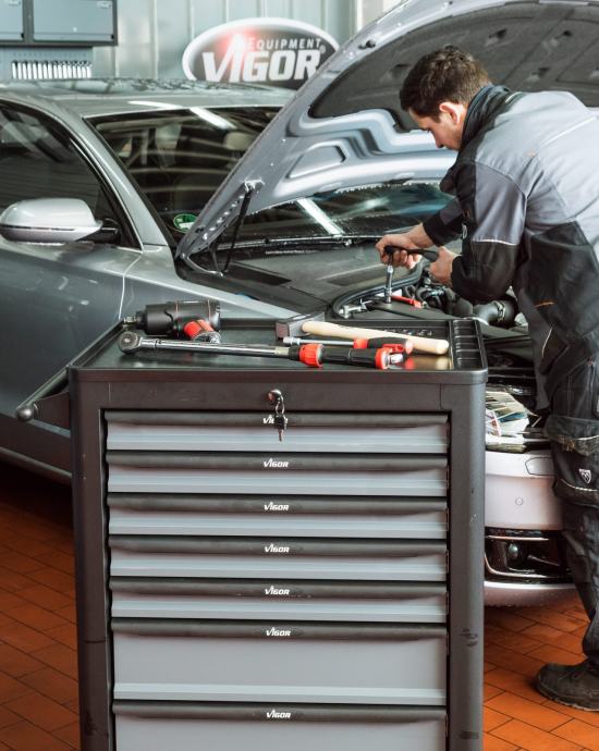 Vigor V4560-344 voziček napolnjen s kvalitetnim ročnim orodjem – 344 kosov orodja v vozičku.