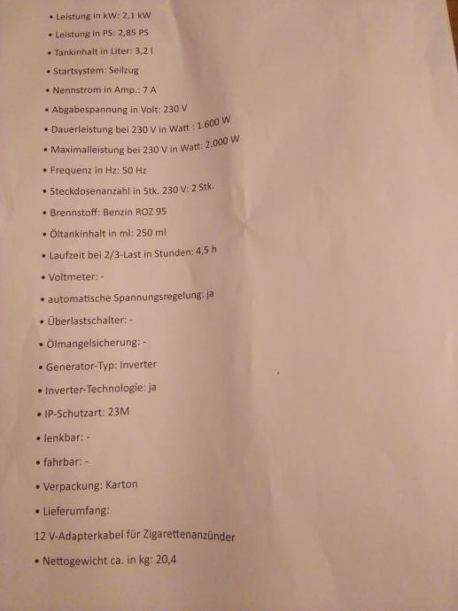 Prodam generator Profiline 220V, 50 Hc,,, 2000 W,,, 7 A,,, 2,1 kW,,, bencinski tank 3,2 litra in s tem zagotovljeno 4,5 ure neprekinjenega delovanja z INVERTERSKO TEHNOLOGIJO,,, OPREMA VOLTMETER, Z DVEMA VTIČNICIMA IN VTIČNICO 12 V,, LAHEK ZA PRENAŠAT 20,4 kg,,, TIHO DELOVANJE, 1 ZYLINDERSKEGA, 4 TAKNEGA MOTORJA 105,6 CM3, MEHKI IN PROŽNI POSEBNI GUMIJASTI POSTAVKI KI OBLAŽIJO TRESENJE NA MINIMUM OB DELOVANJU, RABLJEN 1X CCA 1,2 URE , cena 275 eur, tel, 041 220 212