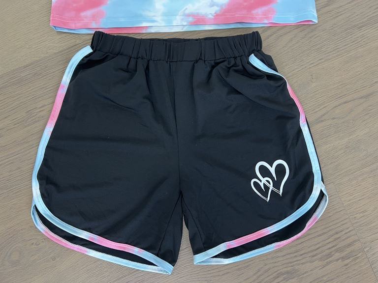 Prodajam pa tudi čisto nov, še nikoli nošen komplet majice (roza-modra in motiv srčkov na sprednji strani) in kratkih hlač (črne barve) za telovadbo. Številka XS. Naročili smo ga preko spleta, pa je žal prišla čisto prevelika številka. Cena: 20€