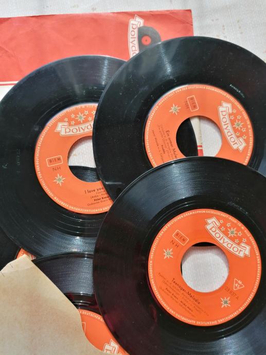 Prodam rabljene male gramofonske plošče založbe Polydor. Na vsaki plošči sta dve pesmi večinoma enega izvajalca, ki poje v nemščini. Seznam plošč je: