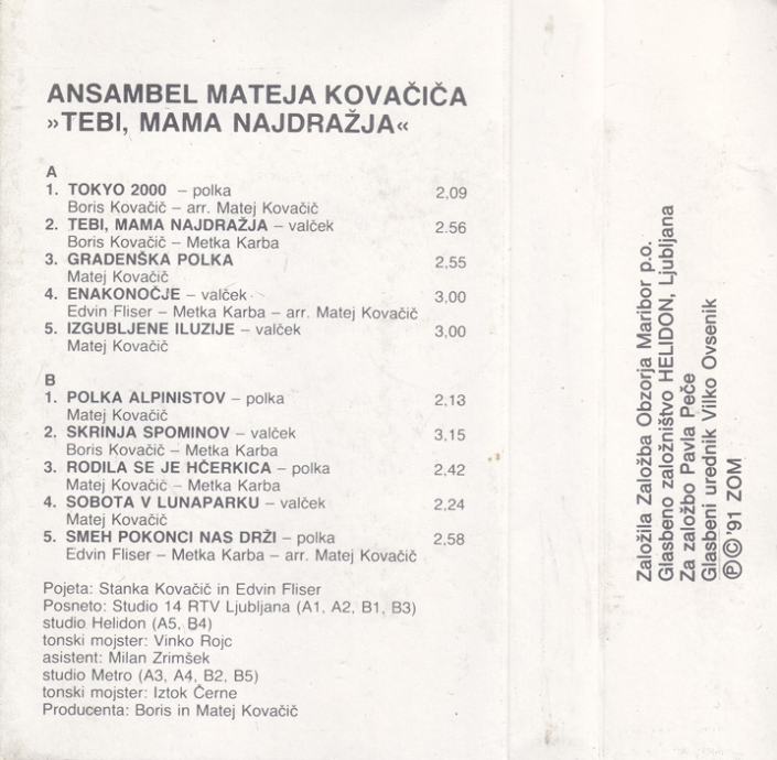 kaseta ANSAMBEL Mateja Kovačiča - Tebi mama najdražja