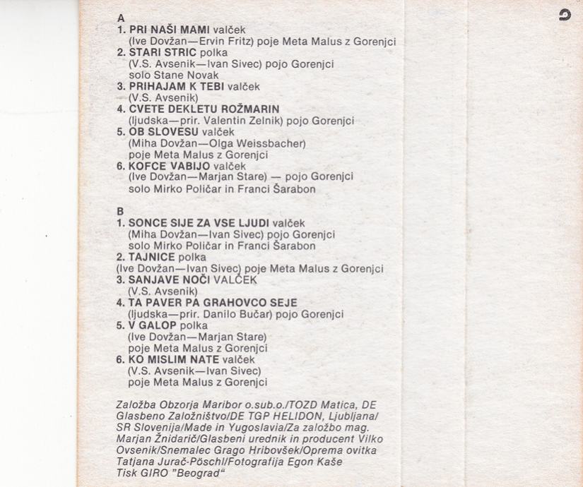 kaseta ANSAMBEL Mihe Dovžana - Pri naši mami