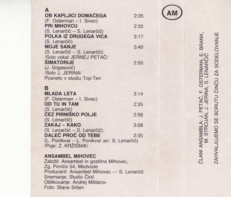 kaseta ANSAMBEL Mihovec - Ob kapljici domačega