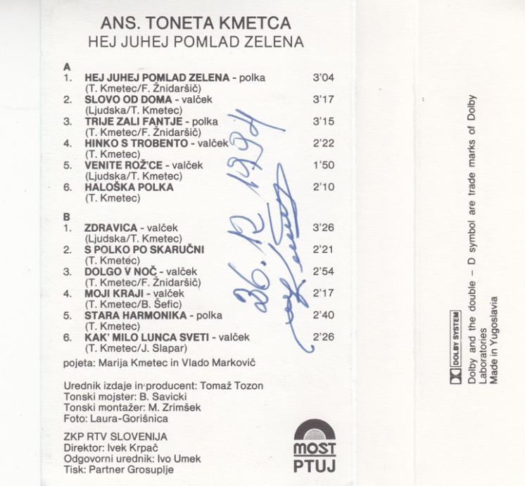 kaseta ANSAMBEL Toneta Kmetca - Hej juhej pomlad zelena