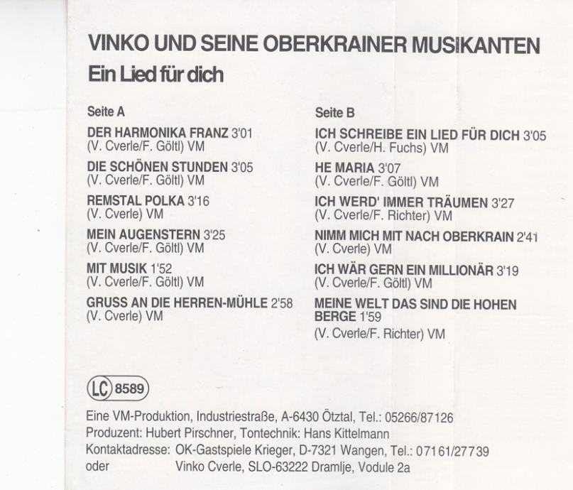 kaseta ANSAMBEL Vinka Cverleta - Ein Lied Für dich