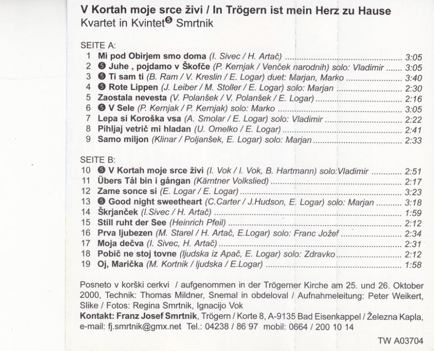 kaseta Kvartet in Kvintet Smrtnik - Mi pod Obirjem smo doma