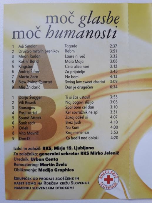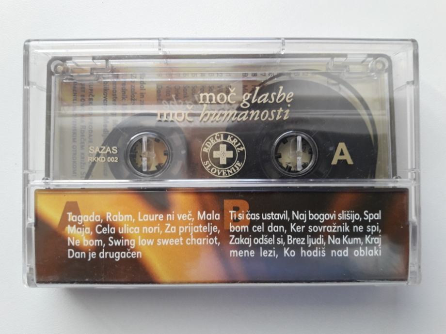 Audio kaseta Moč glasbe, moč humanosti - z raznimi slovenskimi izvajalci: Darja Švajger, Andrej Šifrer, Rok 'n' Band, Dan D, Miran Rudan, Vili Resnik, Društvo mrtvih pesnikov, Adi Smolar, itd.