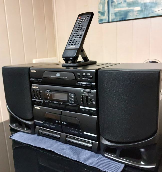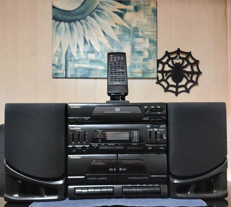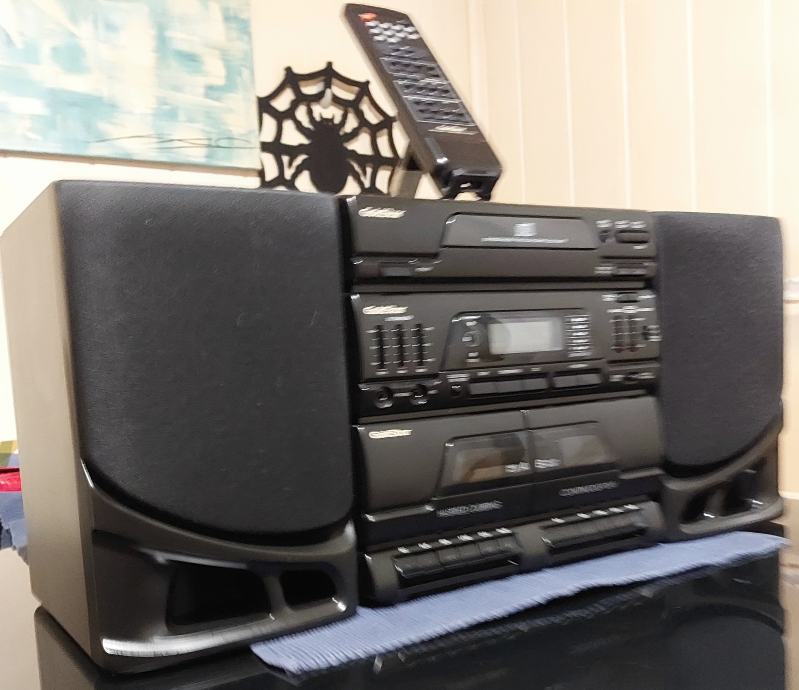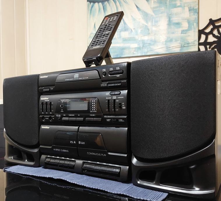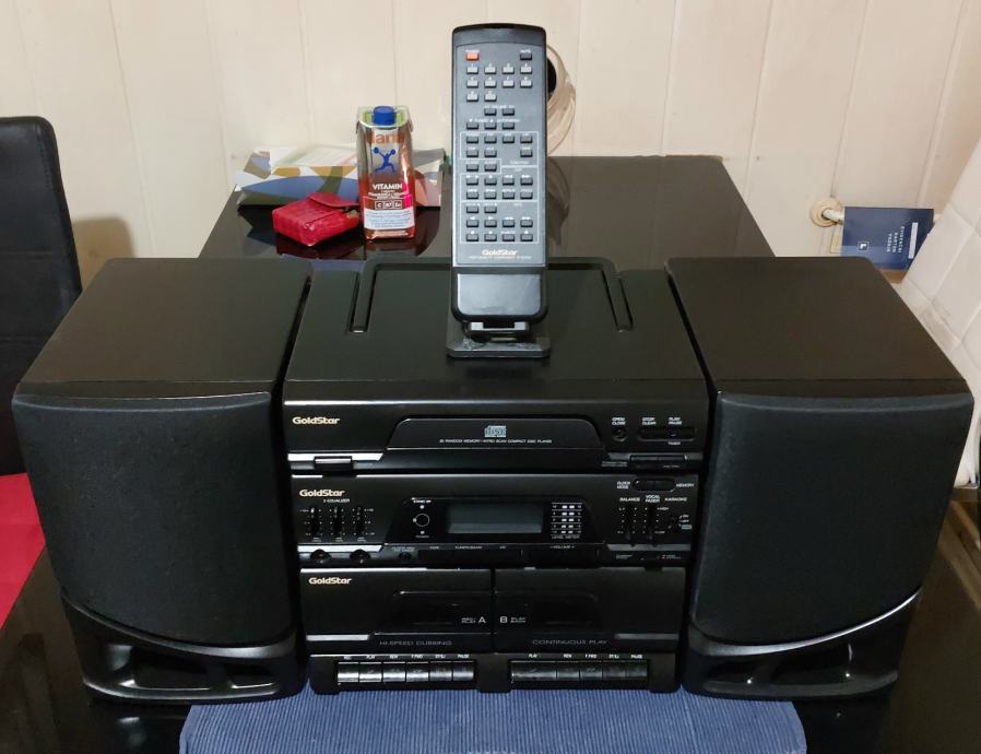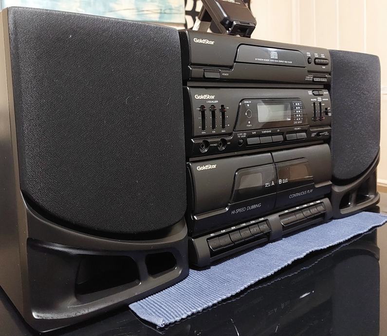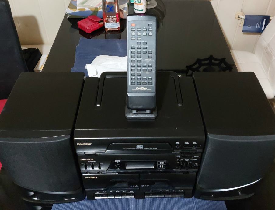 Prodajam ugodno prenosni glasbeni stolp z daljincem GOLDSTAR v vintage izvedbi z ločljivimi zvočniki. Gre za velik in težak sistem, Dolzine: 60cm, Sirime: 22 cm, Visina: 27cm, Teza cca 7 kg. Združuje retro videz s praktičnostjo zaradi možnosti ločitve zvočnikov od glavne enote. Trenutno deluje samo mocan ojacevalec in radio z kvalitetnim sprejemom posta in zvokom, cd bi bil verjetno samo za spucati laser, kasetofon se tudi odzivata in delujeta seveda oba ampak, same gumice so dobre manjka spredaj kolescek ampa to na obeh.Stolp deluje na 220V, 12v, in baterije. Enkratna stvar za kasen vikend, delavnico, garazo, servis, pisarno, dom, trgovino itd ,tam kjer ranite samo rado, brez cd in kasetofona, ce bi vse delovalo bi bila cena 100e , ker take prrodajajo na bolhi od 100e pa do 300. Drugace stolp vrhunsko ohranje glede na svoja leta razvidno iz slik. Tel 031744457 lp