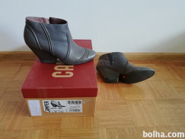 Prodajam sive Camper gležnjarje z visoko peto št. 38. Bili so dvakrat nošeni. Prodajam jih, ker je peta zame previsoka.