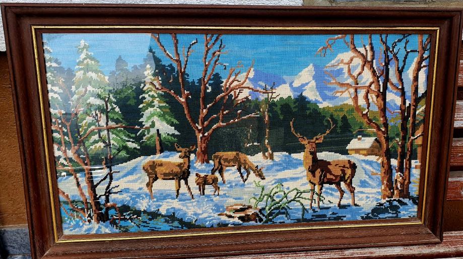 Gobelin - jeleni, 45 let star, dimenzij 103 × 60 z okvirjem, lepo ohranjen.