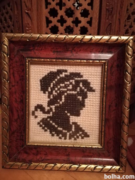 Čudovit manjši gobelin, temno rjava nit. Masiven okvir, zastekljen, z okvirjem 20 x 22 cm.