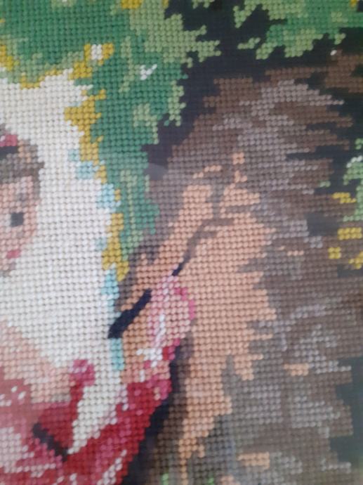 Prodam zelo lep gobelin velikosti 68x82 cm. Narejen z volneno prejo. Originalna črka S na drevesu, ki jo piše dekle je spremenjena v črko F. Primerno tudi za darilo nekomu, ki ima začetnico F.