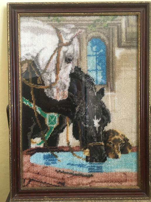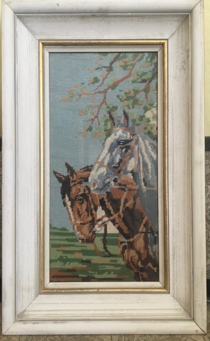 Gobelina v okvirjih. Dimenzija prvega: 76 x 55 cm.