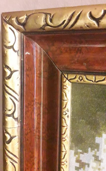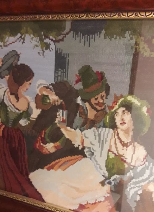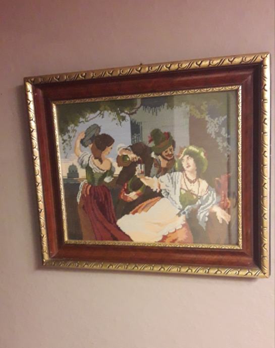 Starinski goblen, okvirjen z ročno izdelanim lesenim okvirjem.