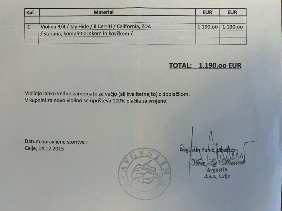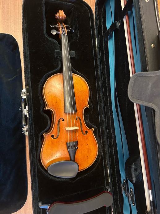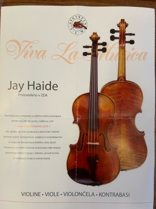 Prodamo violino 3/4, Jay Hide/II Cerriti/ California, ZDA / starana, komplet z lokom, mostičkom in kovčkom. Violina ima zelo lep in čist zvok, primeren za profesionalne koncertne nastope. Strune so zelo lepo ohranjene, lok brezhiben in ogrodje violine popolnoma ohranjeno. Mostiček je lahek in udoben. Violino je kasneje možno zamenjati za večjo z doplačilom, kjer se upošteva celotna kupnina, priložimo račun. Smo iz Celja. Cena je 1.190,00 eur. Pokličite na tel: 031627420, Doroteja