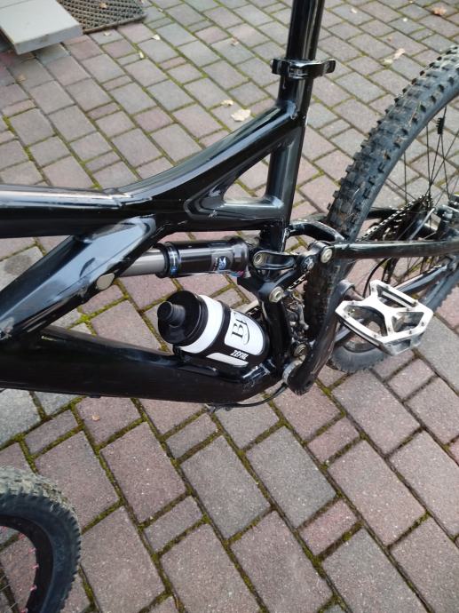 Zadnji amortizer: zadaj pa ima Fox Float RP2 amortizer, 8.5" × 2.125" (216 × 54 mm), 160 mm hoda, z nastavitvijo ProPedal in rebound, v črni barvi z modro ProPedal ročico.