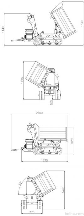 Jansen RD-1000 gosenični prekucnik ima 13KM bencinski motor z ročnim in električnim zagonom. Gosenični prekucnik ima svoj pogonski sistem in hidravlični sistem za kipanje. Naš mini prekucnik se s to funkcijo loči od konkurence. Postopek dviganja in spuščanja je končan v nekaj sekundah. Keson ima dimenzije 103x67x46cm.