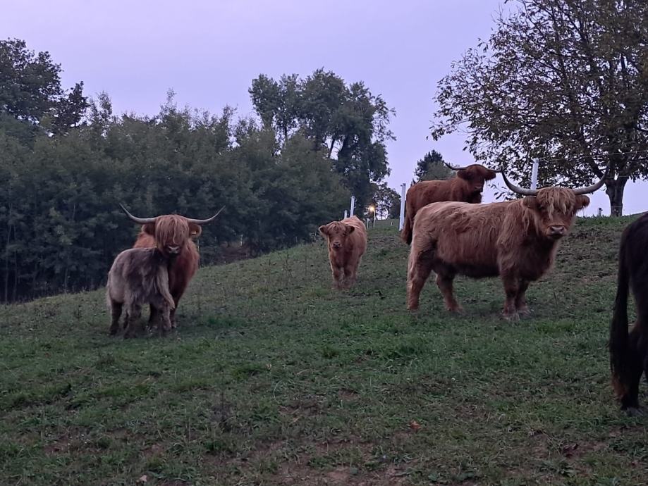 Je vedno zunaj v naravi in ne rabi hleva. Oče je sive barve - pravi bik škotski kapitalec, mama pa rjave barve, ki je petič kotila to kravico.