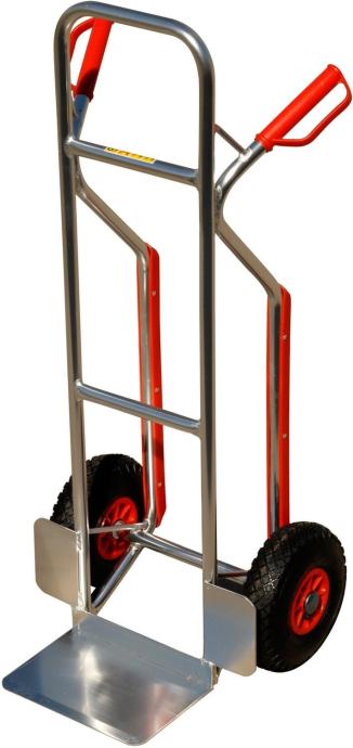 Aluminijast voziček za vreče z drčo za stopnice je opremljen z 2 kolesoma z zračnicami in krogličnimi ležaji. Poleg tega je opremljen s plastičnimi zaščitnimi drsniki. Varnostna ročaja sta opremljena z lokom za zaščito rok. Voziček je izdelan iz varjene aluminijaste konstrukcije, zato je zelo lahek in tehta samo 6,7 kg. Mere nakladalne površine znašajo (Š x G) 30,5 cm x 20 cm.