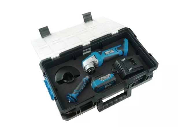 V praktičnem kovčku dobite baterijski kotni brusilnik skupaj z baterijo in polnilcem.