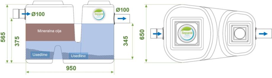 Gravitacijski polietilenski lovilec olj SEPARAT Hydro LOG SENDD150 NS=0,5 L/s z integriranim usedalnikom je sestavljen iz sedimentacijskega (usedalni volumen) in akumulacijskega območja (volumen za izločene lahke tekočine), v katerem poteka ločevanje lahkih tekočin (gostota ≤ 0,85 g/cm³) in grobih agregatov (blato, pesek in mulj).