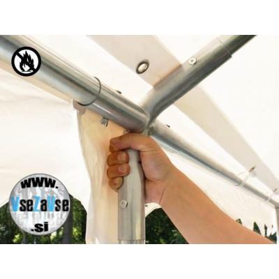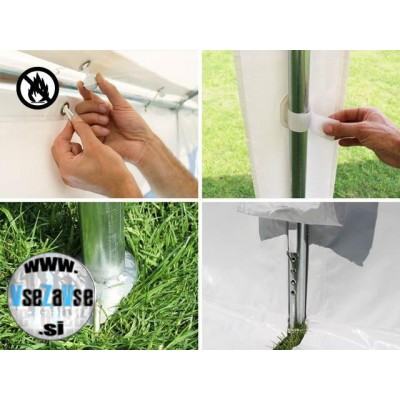 Ta šotor za zabave ima okvir, ki ga je enostavno sestaviti, izdelan iz pocinkanega jekla, odpornega proti koroziji, in PVC ponjav 750N, z mrežasto notranjo tkanino. PVC ponjave nudijo visok zaščitni faktor 50+, so izjemno trpežne, odporne na vremenske vplive in 100% vodotesne. Stranske dele je možno pritrditi posamično na razdalji 2 m in tako omogočiti veliko variant montaže.