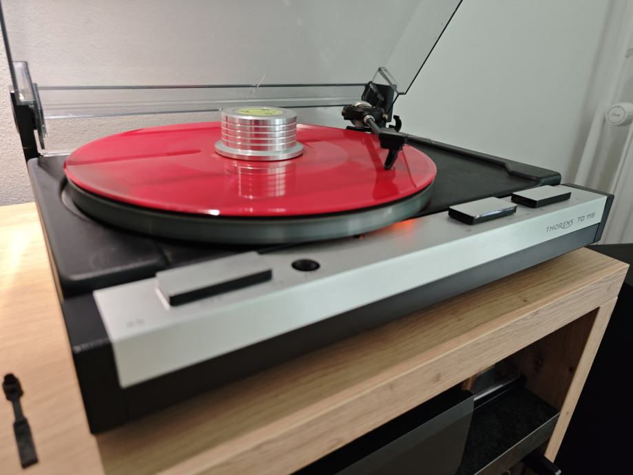 Klasičen gramofon Thorens TD 115 z legendarno švicarsko izdelavo. Odličen mehanski dizajn s plavajočo šasijo, tihi DC motor in natančena linearna ročka. Je mogoče, glede na kvaliteto, malo zapostavljen, čeprav gre za enega od najbolj uspešnih in prodajanih gramofonov srednje klase. Glede na kvaliteto in moje izkušnje bi ga osebno uvrstil precej višje. Saj to zasluži.