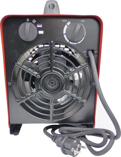 Električni ventilatorski grelec s priključkom na cev (Ø 19 cm) in toplotno močjo 3.000 vatov (3 kW).