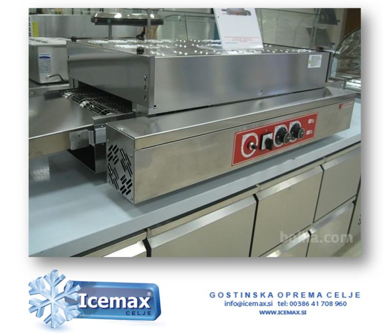 Peč deluje NA PRINCIPU TEKOČEGA TRAKU spodaj in zgoraj grelci,z nastavitvijo hitrost tekočega traku reguliramo peč.Zmogljivost peke 60 pic na uro.Poleg pizz lahko v tunelski peči pečemo tudi ostalo hrano.