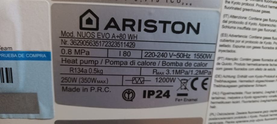 Moč 1200 W. Tihi način delovanja Silent. Kompaktna. Deluje v temperaturnem območju od -5 do 42 °C. Ima jeklen rezervoar, emajliran s titanom. Magnezijeva anoda ščiti pred rjavenjem. Kondenzator ovit okoli bojlerja. Zaščitena pred zmrzaljo do -20st. Čas ogrevanja: 5h 35 min. Sezonski donos: 107,1%. Maks. temperatura vode: 62 °C. Hrup: 50 db (A). Povprečna poraba el. energije: 250 W. Največja napetost / moč: 220–240 V / 1550 W. Moč upora: 1200 W. Električna zaščita: IP24. Nazivna zmogljivost shranjevanja: 80 l. Največji delovni tlak: 8 bar. Standardni pretok zraka (avtomatska modulacija): 100–200 m3/h. Najmanjša prostornina namestitvenega prostora: 20 m3. Debelina izolacije: 41 mm. Premer priključkov za vodo: 1/2 M". Teža prazne: 50 kg.
