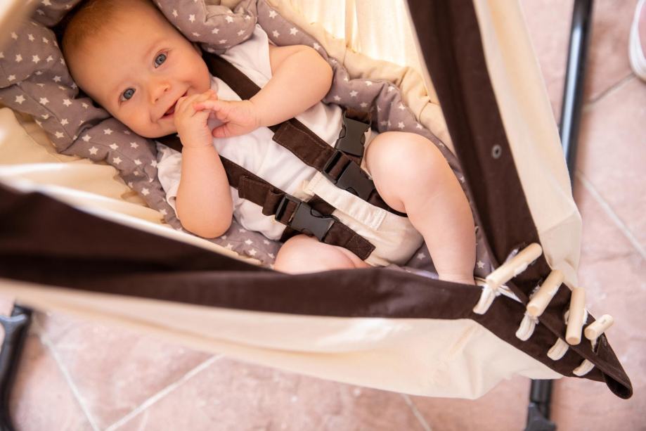 Otroška viseča mreža Kangoo varno ovije vašega otroka in mu zagotavlja varnost. Tritočkovni varnostni pas in dodatni leseni gumbi na sprednji strani zagotavljajo varen spanec malčka.