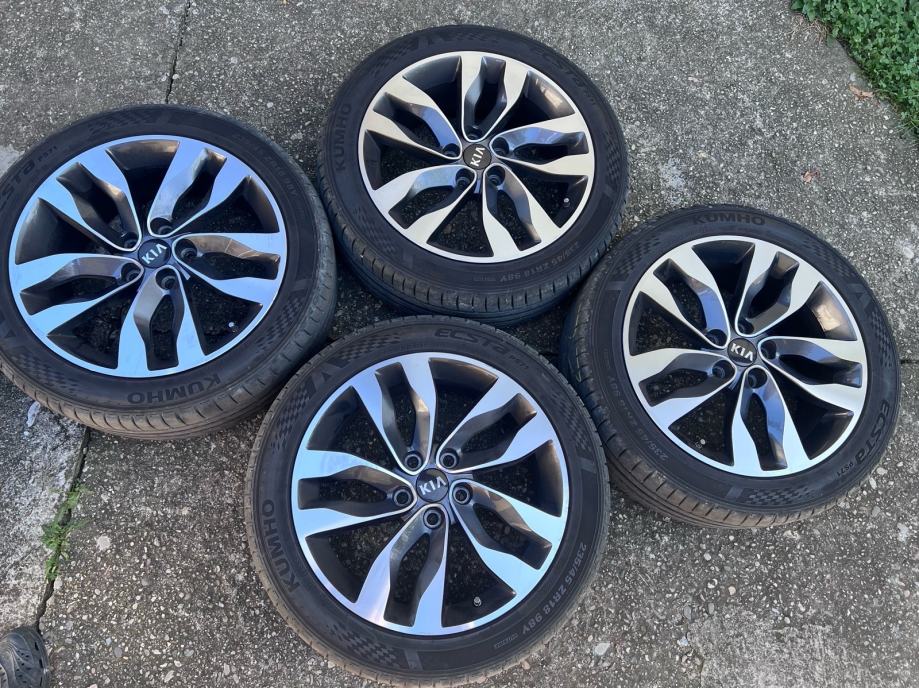 Prodam komplet 4-ih lepo ohranjenih alu platišč z letnimi pnevmatikami Kumho in senzorji TPMS za avte Kia, Hyundai.