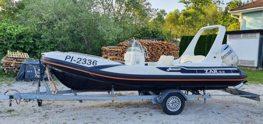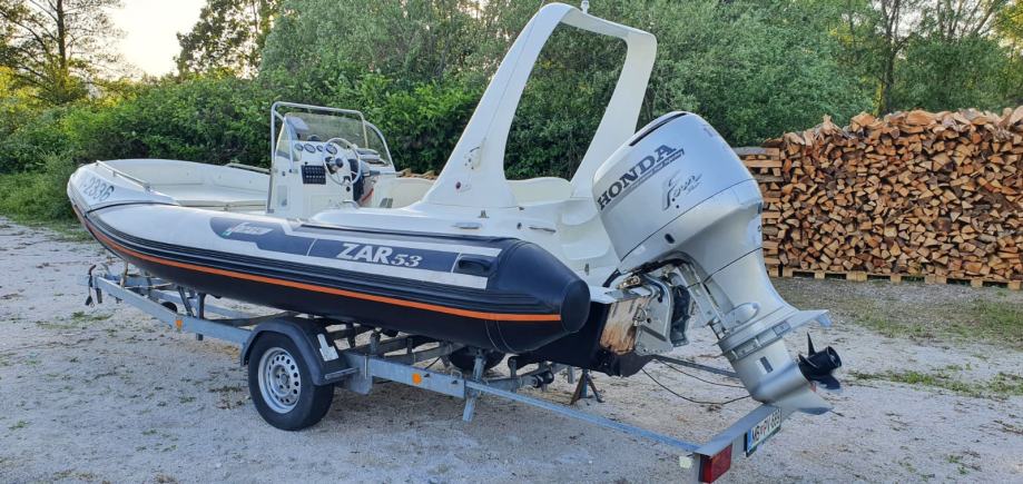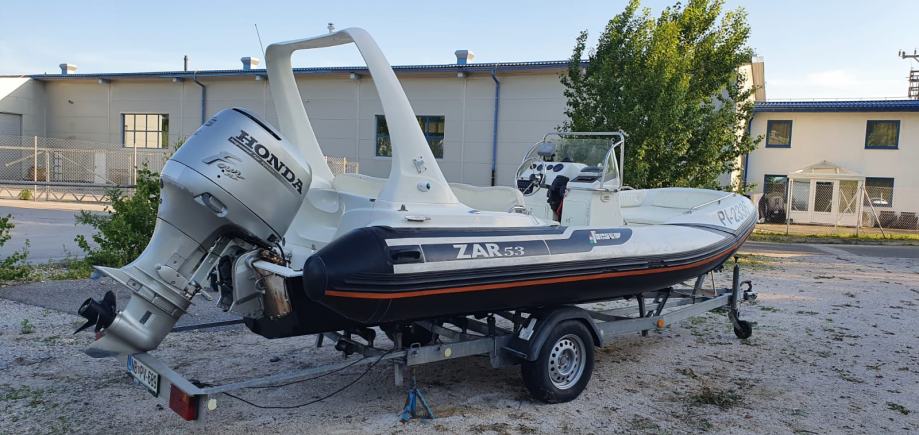 To je ZAR rekordov: udobnih 8 sprednjih sedežev, zakonska postelja, 8 odlagalnih površin za shranjevanje prtljage in vrsta edinstvenih kombinacij sedežev/postelja za sončenje/postelja/miza (miza ni vključena). Ta čoln je revolucioniral koncept gumijastih čolnov, v samo 5,35 metra zadrži vse novosti, ki jih uvaja “ZAR project”. Idealno za družino, ki lahko uživa v čudovitih avtonomnih navtičnih kampih dnevih (in nočeh) ZAR 53 je odličen za vse namene. Nosi visokokakovostni motor HONDA ( 115 KM) in ponuja izjemne zmogljivosti brez pomanjkljivosti za prijetno jadranje.