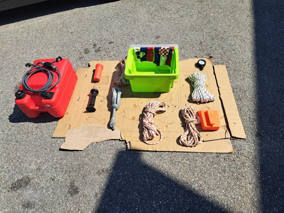 - V kompletu pride vsa predpisana dodatna oprema, ki je potrebna za plovbo: sidro, vse potrebne vrvi, škvorc za izmet vode, luč, orginal tank 24 litrov ... Vse se vidi na priloženi fotografiiji.