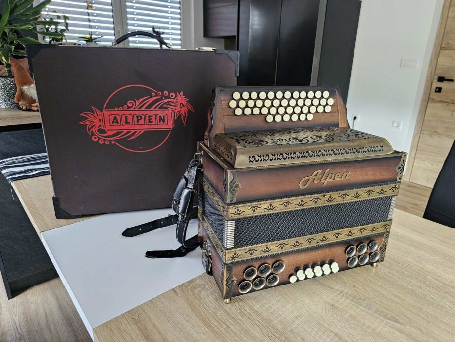 Prodam pro diatonično harmoniko Alpen, kot nova, nepoškodovana. Odlično ohranjena, malo rabljena, CFB 38, 6 dodatnih gumbov, argonomski pasovi, glasna, kovček.