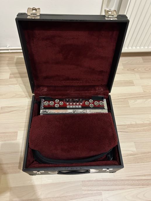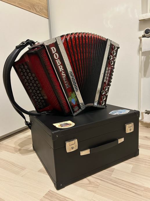 Prodam omenjeno diatonično harmoniko Dobršek, uglasitve B Es As in velikosti 38. Harmonika je odlično ohranjena, nikoli poškodovana, čuvana in igrana z občutkom. Sem 1. lastnik harmonike, katero je gospod Dobršek naredil po mojem naročilu leta 2017. Prodajam samo zaradi nakupa novejše harmonike z drugo uglasitvijo in nerabim dveh harmonik. Zraven pripada tudi kovček.