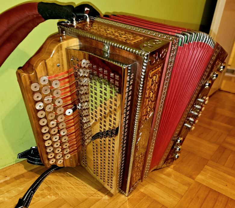 Odlična, s kovčkom, izredno mala poraba zraka, vrhunski zven, 36cm, GCF. Brezhibna. Slakov gumb, šesti bas, prsna podloga, novi, široki pasi.