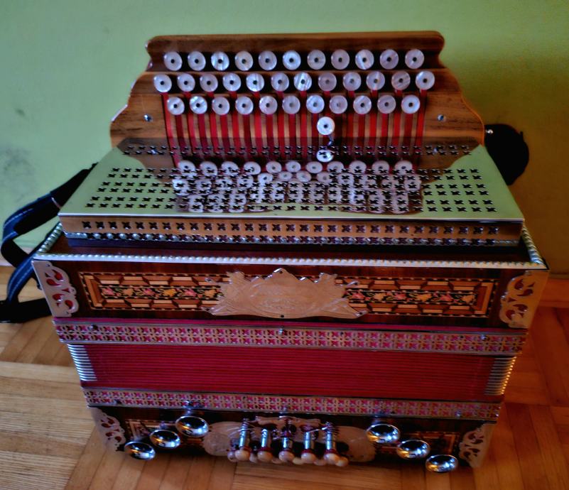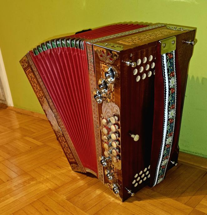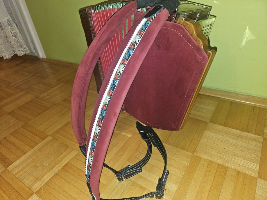 Novi, široki pasovi, nastavljiv basni pas, prsna podloga, Slakov gumb, 6. bas.