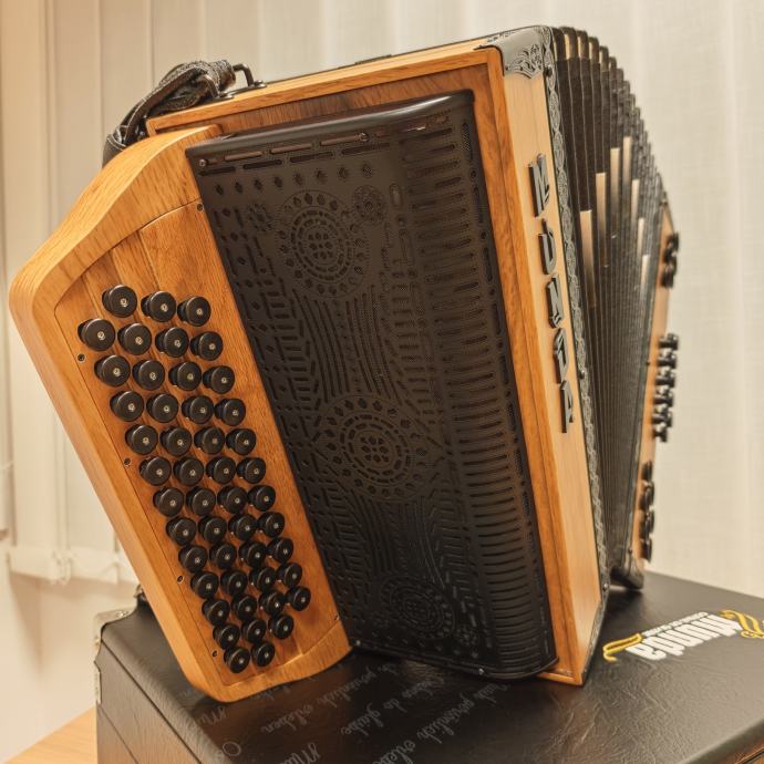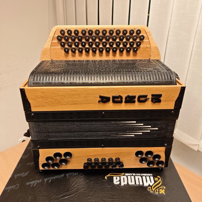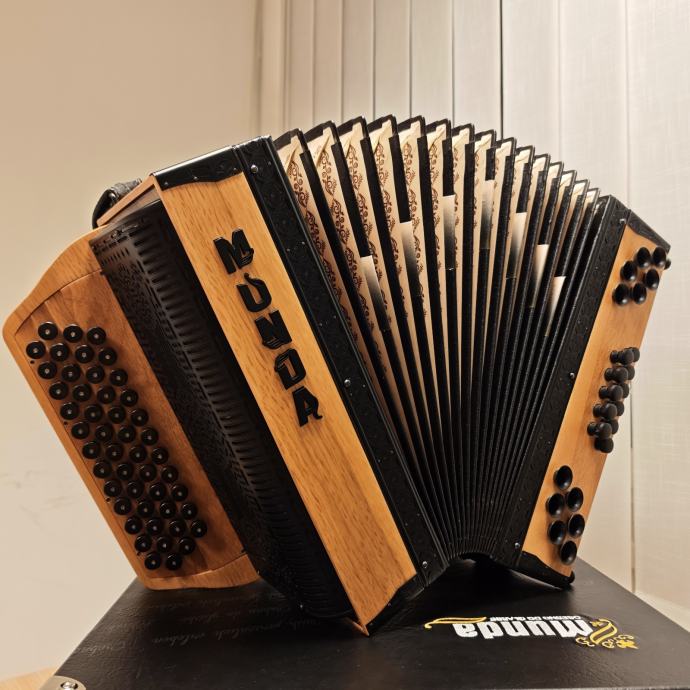 Prodam diatonično harmoniko Munda, velikost 38, CFB uglasitev, Amano glasilke, 11 poltonov, leseni gumbi, usnjena blazina na basnem pokrovu.
