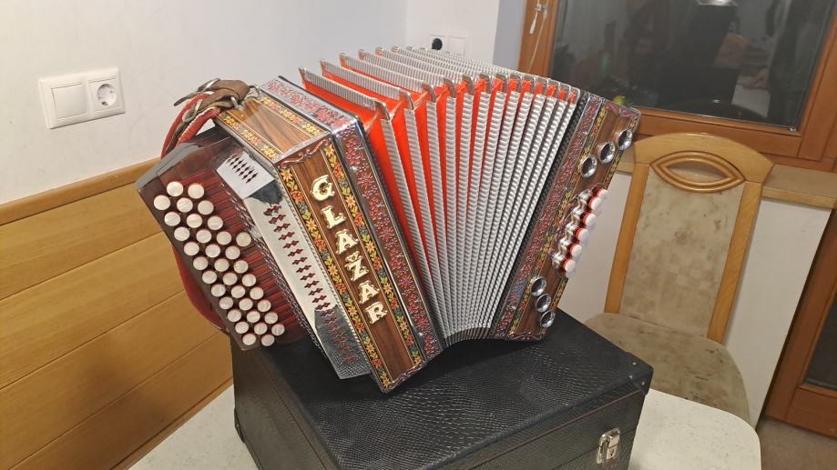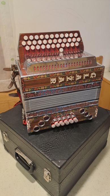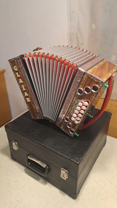 Prodam odlično ohranjeno otroško diatonično harmoniko uglasitev CFB, velikost 30 cm.