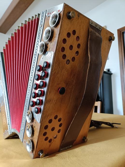 Prodam harmoniko znanega mojstra Alojza Prostorja iz leta 1975 duri CFB velikost 36 cm. Harmonika je odlično uglašena, odzivna, glasna in vsebuje kakovostne glasilke Salpa a mano. Štima je rahlo znižana na A=870 kot je uporabljal Slak v preteklosti. Ohišje je iz orehove korenine, v prilogi je tudi originalen in ohranjen kartonasti kovček. Za resnega kupca cena ni zadnja... Kontaktirate me lahko s sporočilom na Bolhi, preko elektronske pošte na naslov samu.33.mian@gmail.com ali na telefonsko številko +393889078948 v popoldanskih urah.