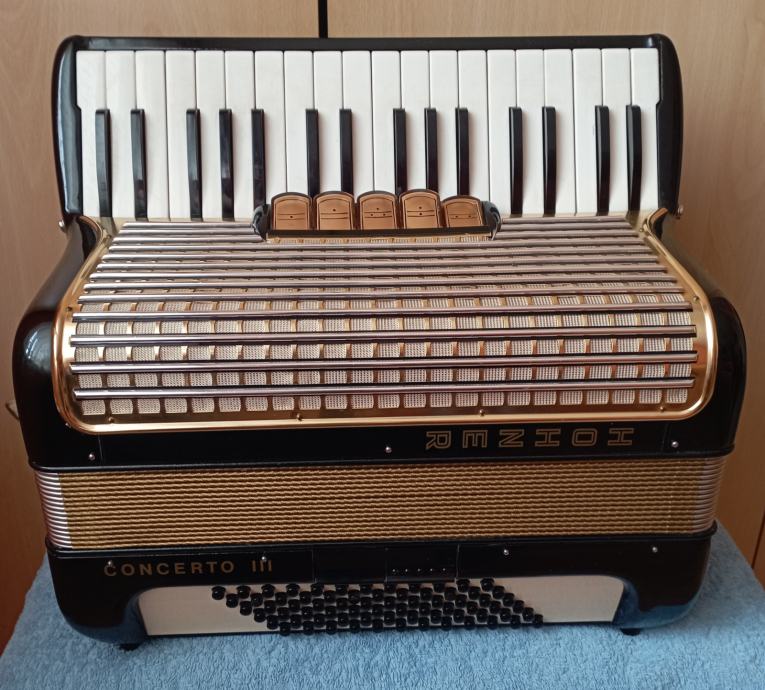 Prodam harmoniko Hohner Concerto III 72 basa 5+2 registra z kovčkom. Harmonika je lahka zelo glasna 3glasna na klavijaturi 5glasna na basih brezhibna brez znakov uporabe kot nova. Inf. 031/530-813.