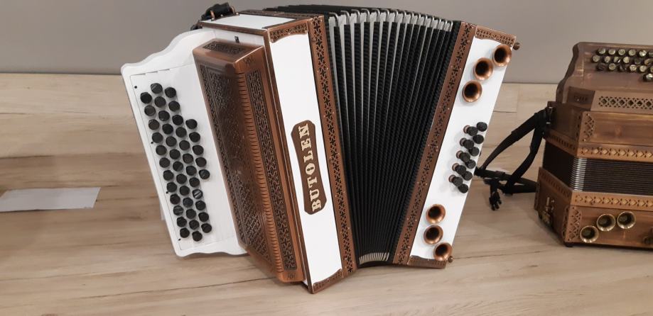 Najem diatonične harmonike Butolen B-Es-As, Letnik 2021, januar. Harmonika je nova, 38 cm visoka, 5 dodatni gumbi.