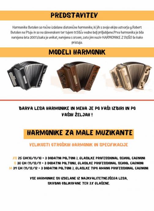 Harmonike so izdelane iz najkvalitetnejšega lesa, vsaka je unikat, barvo harmonike in meha izberete sami.Rok dobave je do največ 30 dni, v kolikor vzamete harmoniko, ki je na zalogi, jo prejmete takoj.