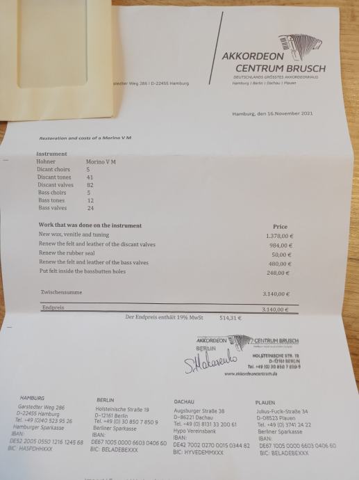 Prodamo odlično ohranjeno harmoniko HOHNER MORINO VM 127 basno. Kupili smo jo z namenom, da bi se jo naučila igrati, vendar me je minila volja. Zato smo se odločili harmoniko prodati. Za več podatkov prilagamo link: https://www.akkordeoncentrum.de/akkordeon/003002/Hohner-Morino-V-M, originalnega oglasa, kjer je bila kupljena pred 3 leti v Nemčiji. Cena je absolutno zadnja. Harmonika je bila generalno obnovljena v Nemčiji v vrednosti dobrih 3000€.