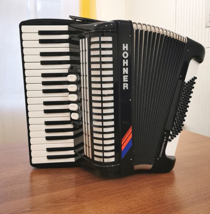 Prodamo odlično ohranjeno klavirsko harmoniko Hohner Concerto III T, 72 basov, 3 glasna, 5 registrov v diskantu, 2 v basih.