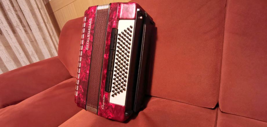 Proda se čudovita in odlično ohranjena 80-basna klavirska harmonika Royal Standard Capella s kovčkom, kupljena okrog leta 1980, torej stara več kot petdeset let.