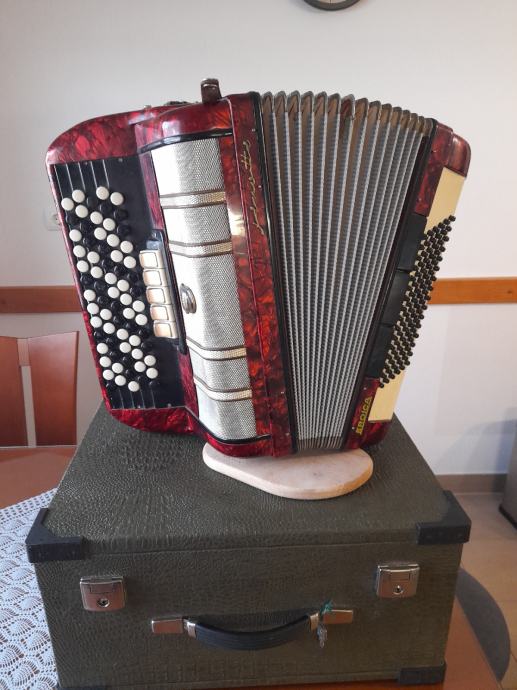 Izdelana v Nemčiji, ima 96 basov, uglašena, ima zamenjana jermena in kovček. Lepo ohranjena.