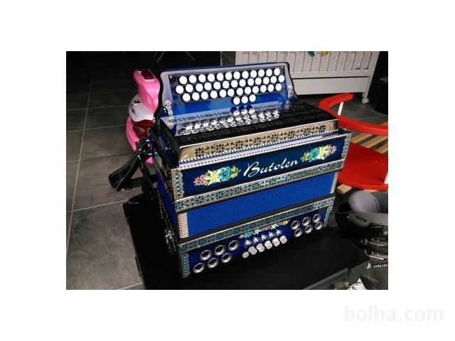 Najem ( izposoja ) diatonične harmonike Butolen B-Es-As, Harmonika je skoraj nova, 38 cm visoka, 3 dodatni gumbi.